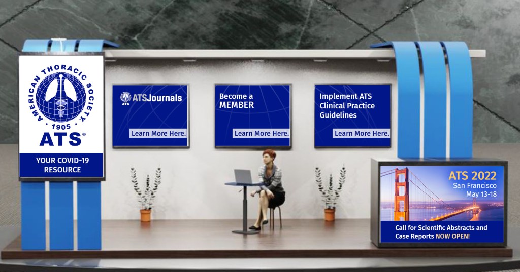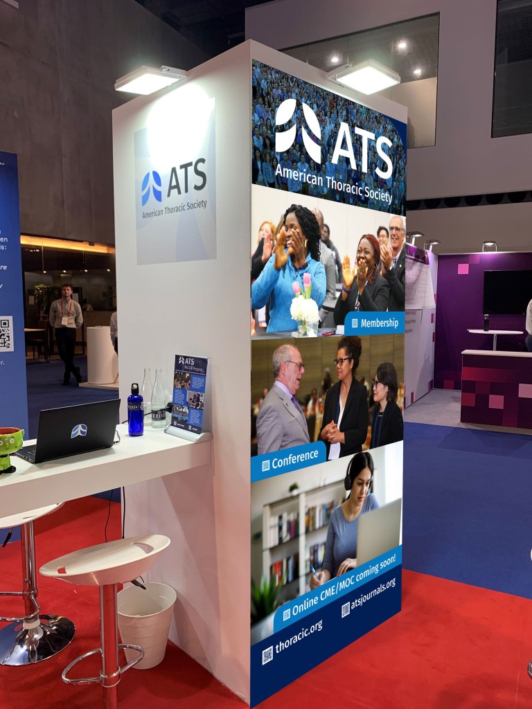 ATS virtual booth at CHEST 2020. Each poster is a clickable button.ATS virtual booth at SPBT 2021 (Brazilian pulmonary conference). Each “poster” here was also a clickable button.I created this 15×6′ graphic to encourage donation to the ATS 2022. Photo: ATS/Ben AsbellATS booth at ERS2022, one of the largest pulmonary conferences in the world. ERS, like many conferences, supplied high regulated, limited booth space for peer societies.